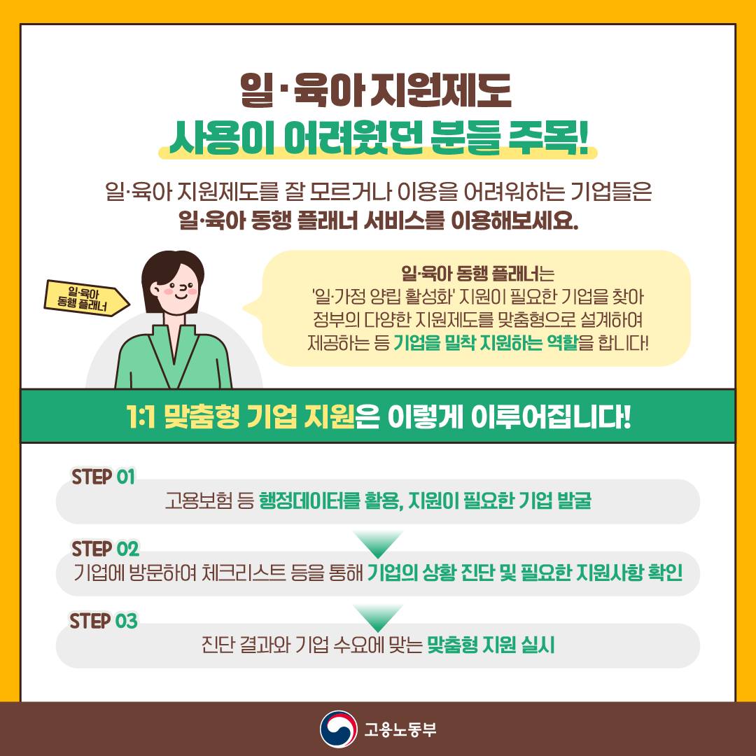 일·육아 지원제도를 잘 모르거나 이용을 어려워하는 기업들은 일·육아 동행 플래너 서비스를 이용해보시길 바랍니다.