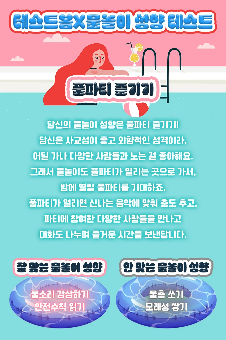 나는 물놀이를 할 때 어떤 모습일지 알아보는 테스트봄에서 나온 ‘물놀이 성향 테스트’를 소개드리겠습니다.