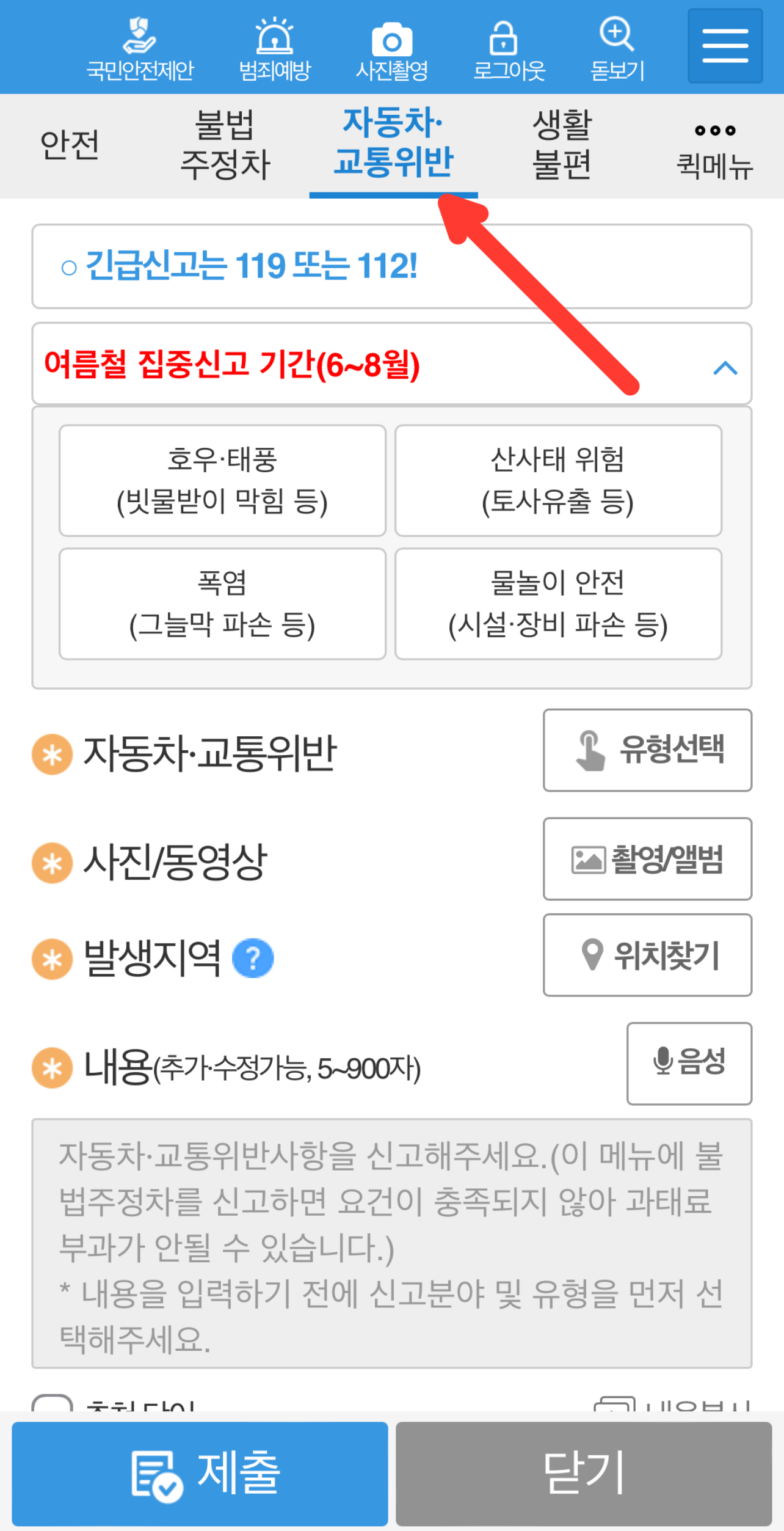 4. 유형선택, 사진 또는 동영상 첨부, 발생지역 조회, 신고내용을 정리 후 스텔스 차량 신고를 하시길 바랍니다.