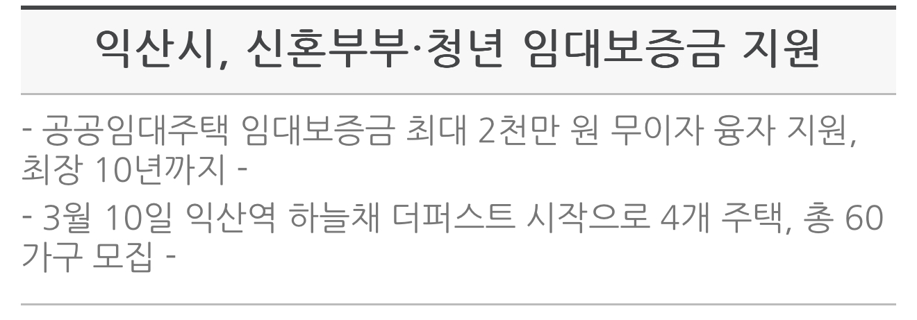 2025년 올해 지원 가구는 60호로 △익산역 하늘채 더퍼스트 △익산 제3일반산단 행복주택 △인화 행복주택 △기타 공공임대주택 등 4개 주택별로 15가구를 모집한다고 합니다.