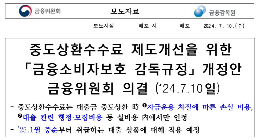 금융위원회(위원장 김주현)는 2024년 7월10일 정례회의에서 중도상환수수료 부과체계 개선을 위한「금융소비자 보호에 관한 감독규정」개정안을 의결하였다고 합니다.