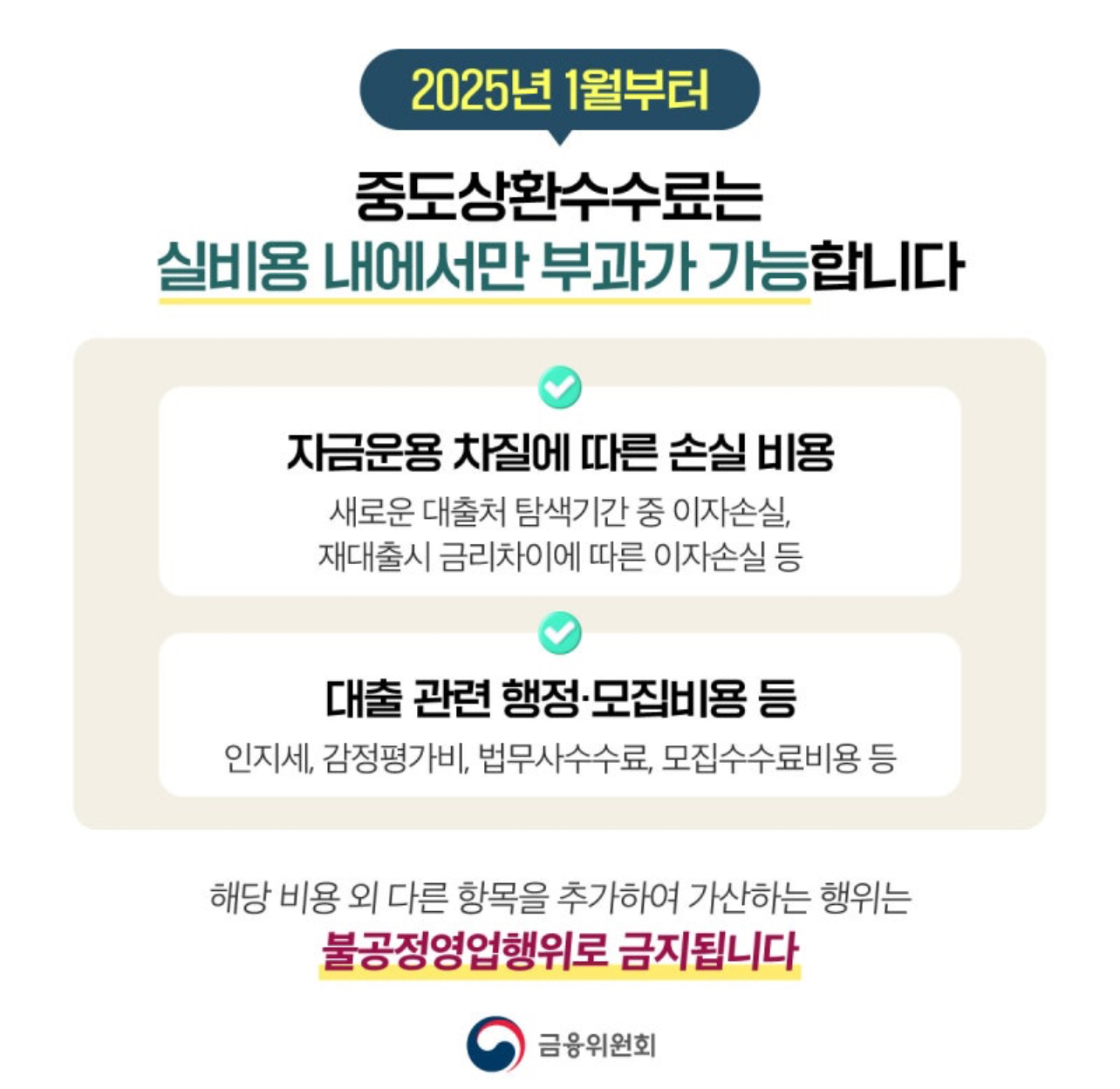 이에 금융위원회는 대출금 중도상환 時 ➊자금운용 차질에 따른 손실 비용, ➋대출 관련 행정·모집비용 등 실비용 內*에서만 중도상환수수료를 부과토록 하며 同 비용 外에 다른 항목을 추가하여 가산하는 행위는「금소법」상 불공정영업행위로 금지하도록 금소법감독규정(§14➅9호)을 개정하였습니다.