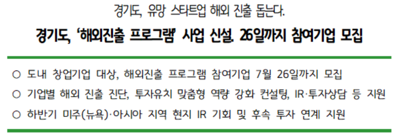 경기도와 경기도경제과학진흥원이 도내 유망 스타트업의 해외진출과 투자유치를 지원하기 위해 ‘스타트업 해외진출 지원 프로그램’ 참여기업을 2024년 7월 26일까지 모집한다고 합니다.