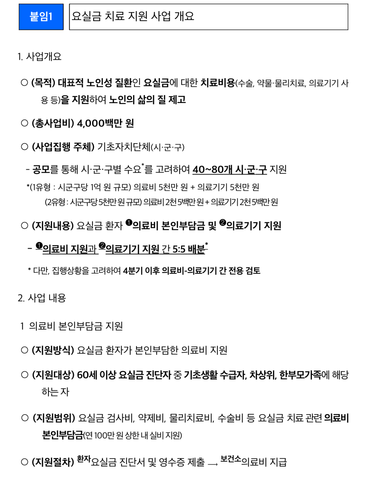 ‘요실금 치료 지원 사업’은 노인들의 사회적 참여를 제한하는 요실금을 적기에 치료받아 노인들이 건강과 삶의 질을 유지할 수 있도록 요실금 관련 의료비와 의료기기 사용을 지원하는 사업입니다.