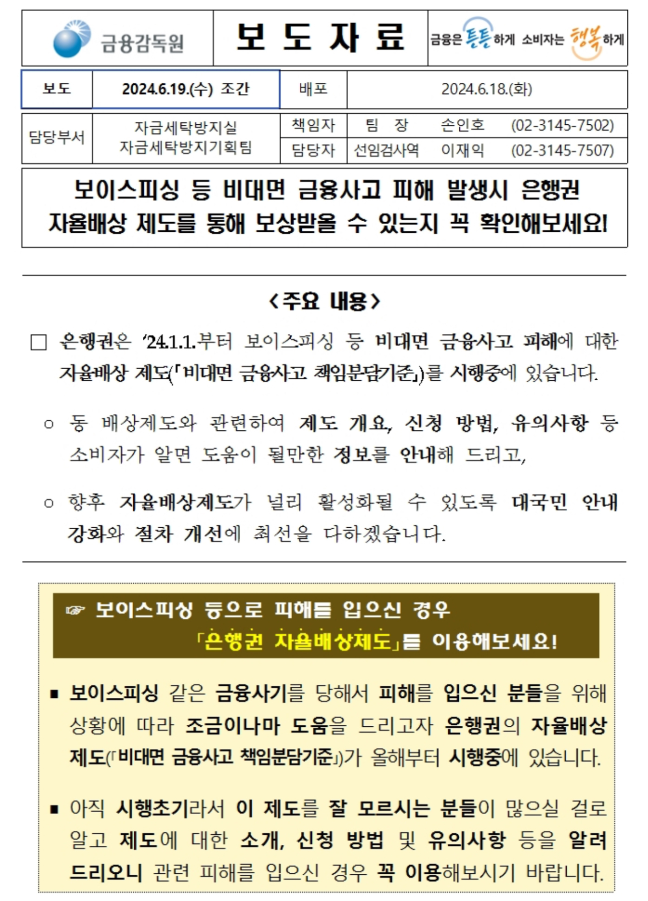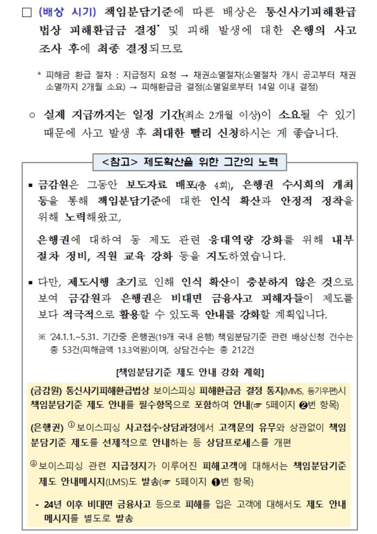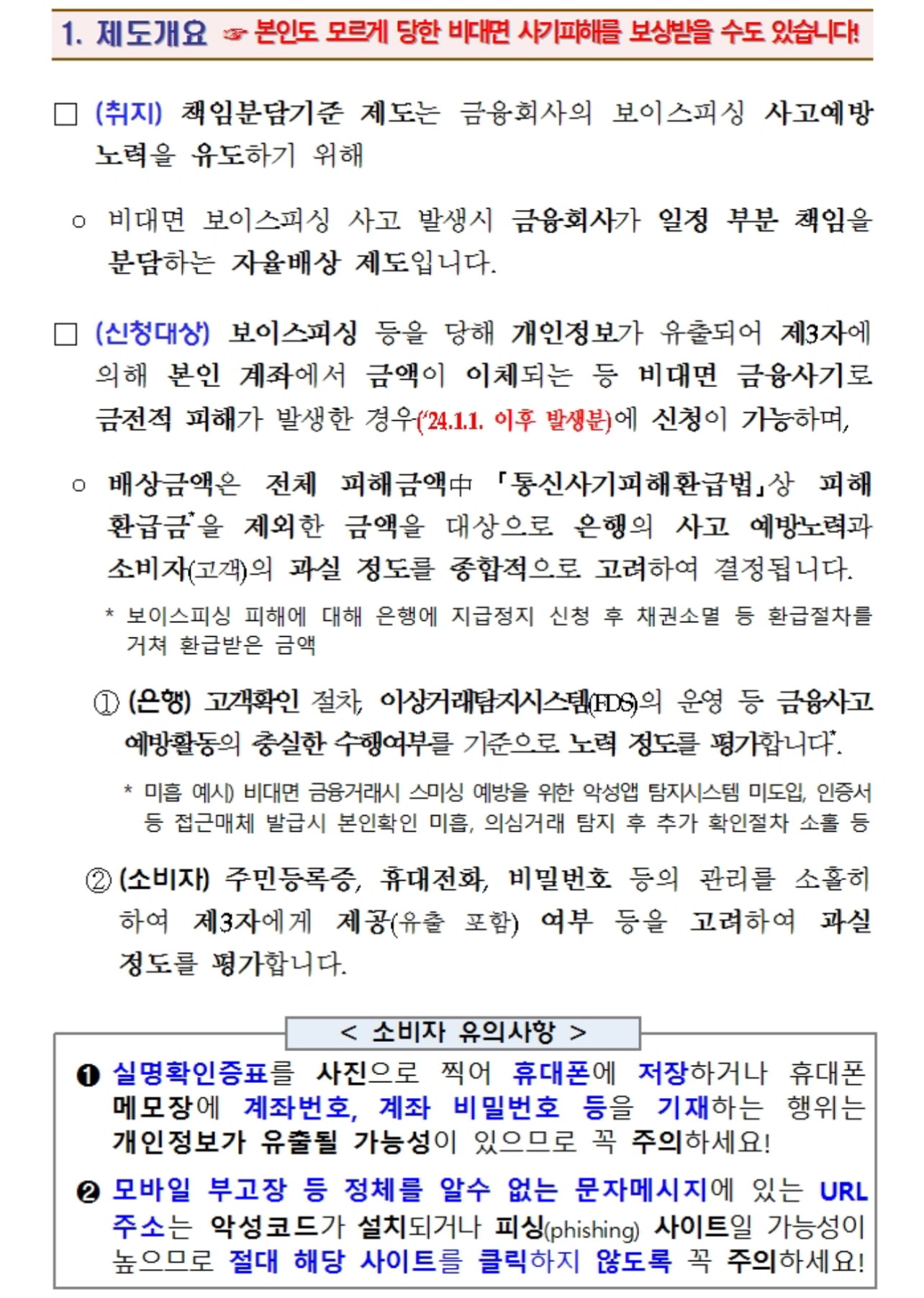 금감원에 따르면 은행권은 2024년 1월1일부터 보이스피싱 등 비대면 금융사고 피해에 대한 자율배상 제도(비대면 금융사고 책임분담기준)를 시행하고 있다고 밝혔는데 다만 아직 제도 시행초기라서 이를 잘 모르는 금융소비자들이 많은 상황이라고 합니다.