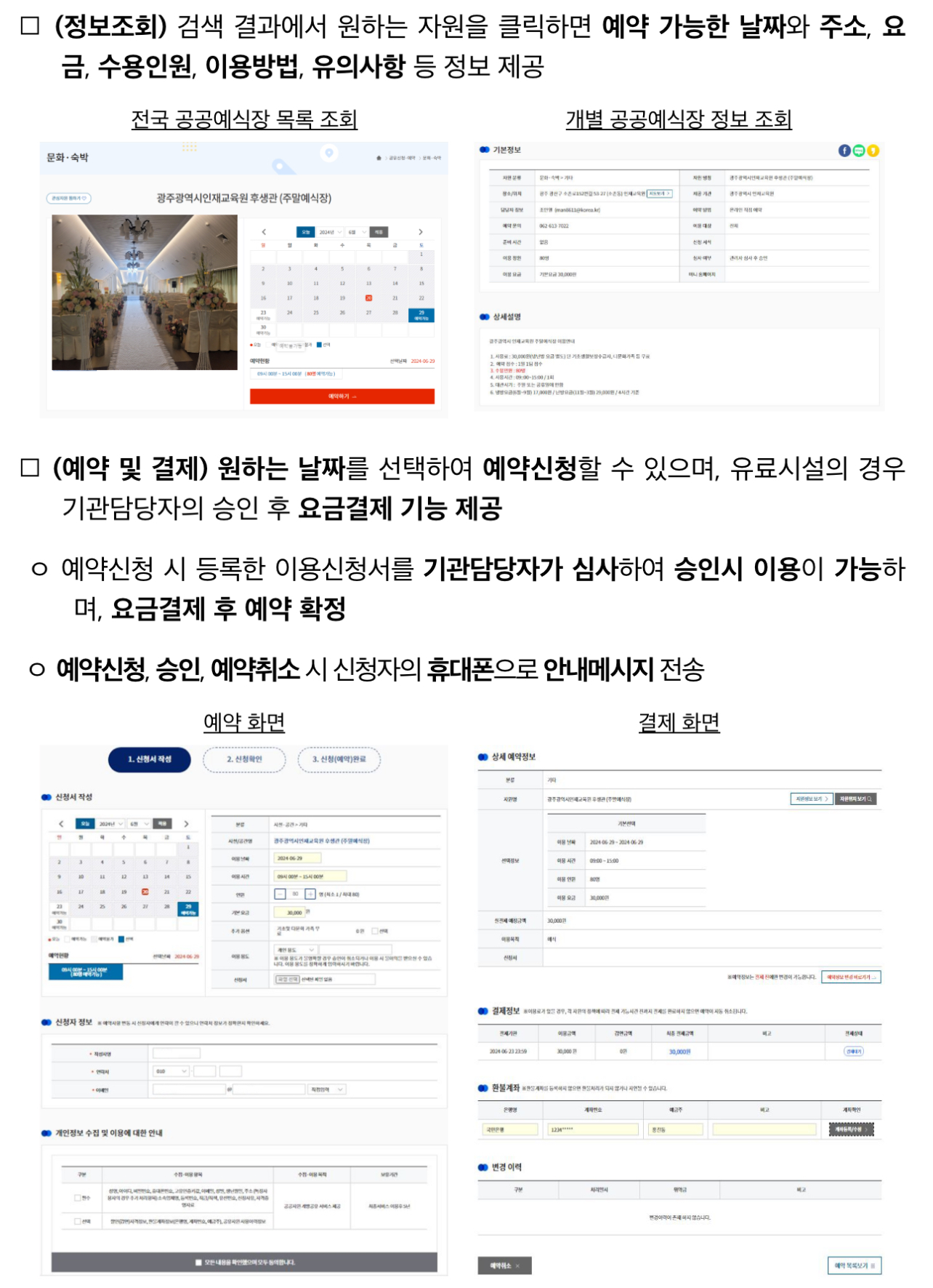 또한, 각 시설별 이용금액, 수용인원, 피로연 가능 여부 등 상세한 정보를 조회한 후 원하는 장소와 대관 일자를 선택해 예약할 수 있습니다.