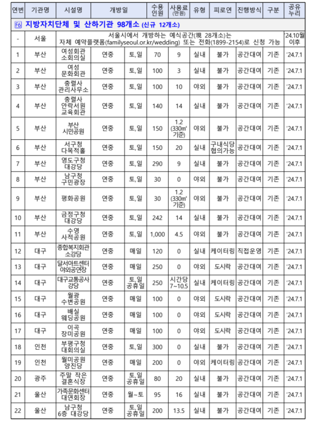이에 예비부부들이 공공 예식공간 관련 정보에 쉽게 접근하여 원하는 공간을 선택할 수 있도록 ‘공유누리*’ 누리집(www.eshare.go.kr)에서 통합 검색·예약서비스를 제공한다고 합니다.
