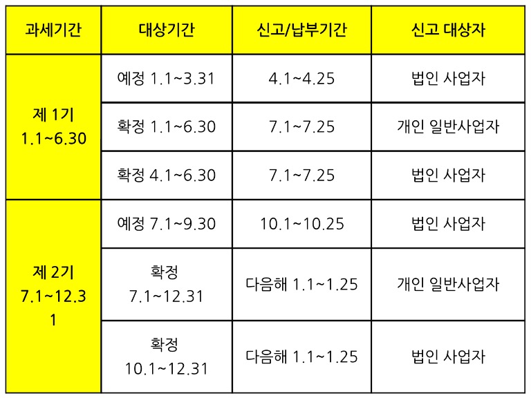 개인 일반사업자 : 확정 7.1-12.31 / 다음 해 1.1~1.25