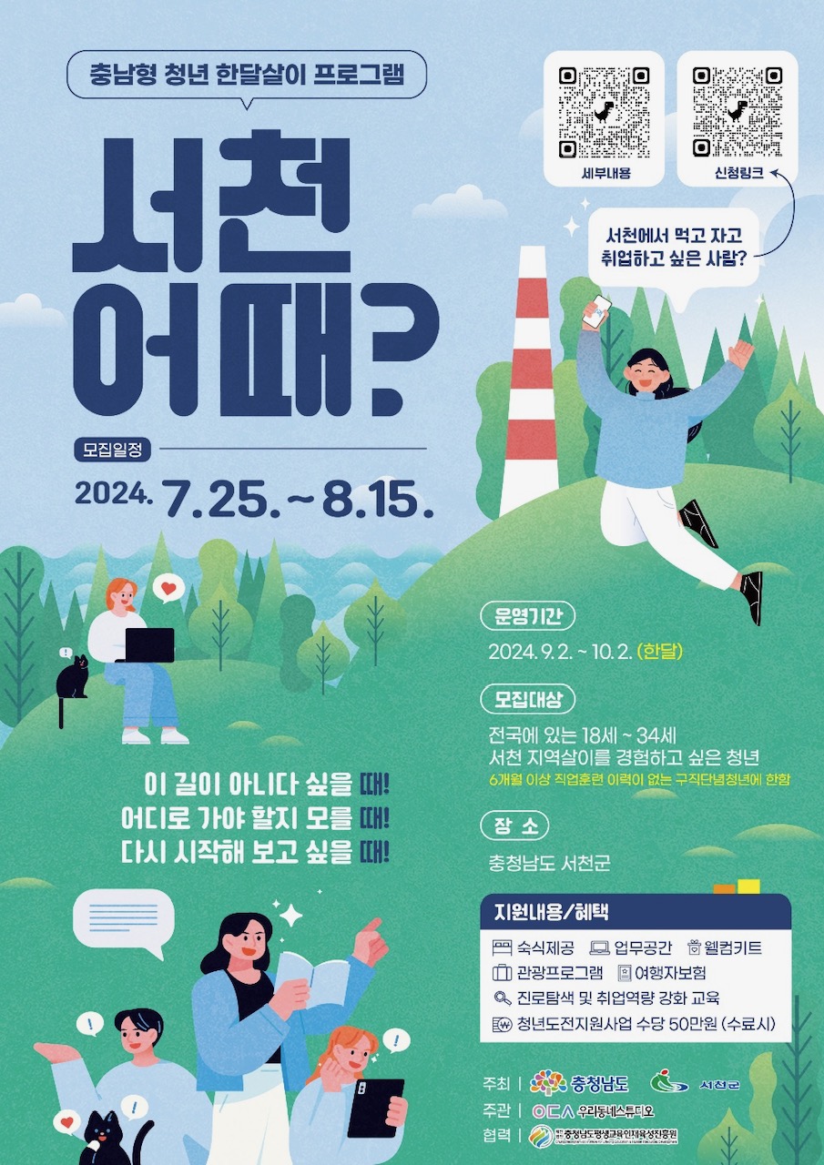 서천군이 충남형 청년 한달살이 프로그램 일환으로‘서천 어때’ 프로그램 참여자를 2024년 8월 15일까지 모집한다고 밝혔습니다.