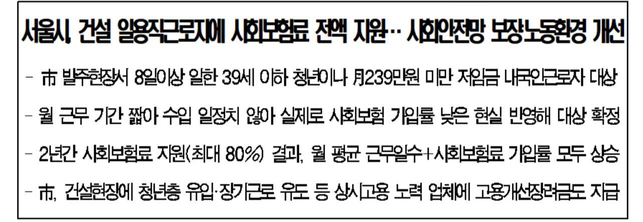 서울시는 '건설일용근로자 사회보험료 지원확대'를 통해 청년층 근로자와 저임금근로자 4800여 명에게 매년 수혜가 돌아갈 것으로 예상하고 있는데 아울러 지원을 확대해 건설현장으로의 청년층 유입과 장기근로를 지속적으로 유도해 나간다는 계획이라고 합니다.