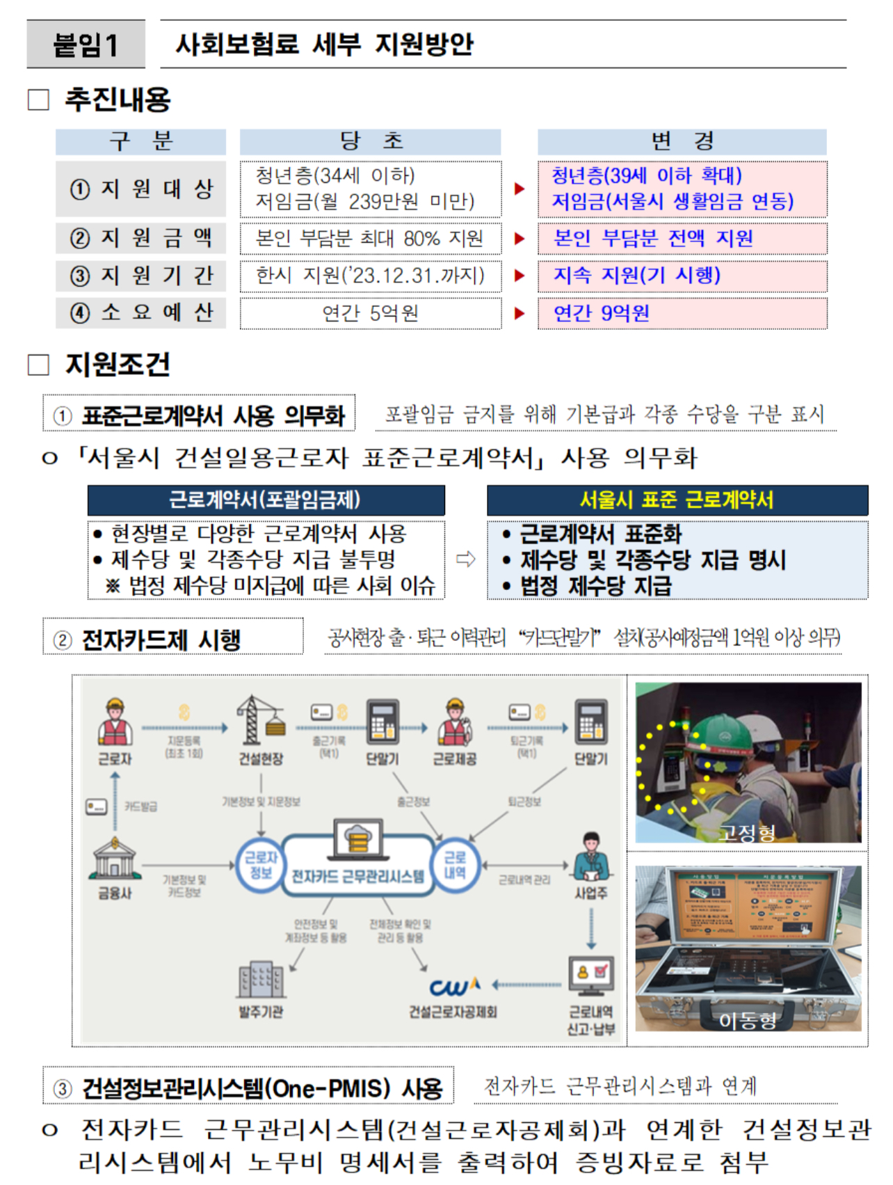 다만 근무 공사장이 서울시 건설 일용 근로자 표준계약서 사용, 전자카드제에 따른 단말기 설치 및 전자카드 발급, 서울시 건설정보관리시스템(One-PMIS) 사용 등을 준수할 경우에만 지원이 가능합니다.