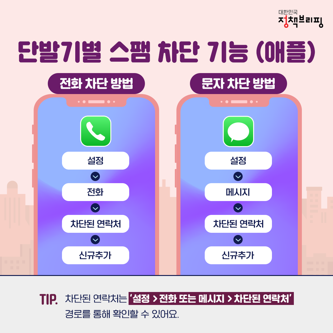 - 전화 차단 방법: 설정 → 전화 → 차단된 연락처 → 신규추가