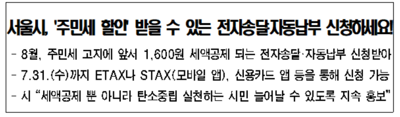 서울시는 주민세 전자송달과 자동납부를 신청하면 800~1600원의 세액이 공제된 전자고지서를 받을 수 있다고 밝혔습니다.