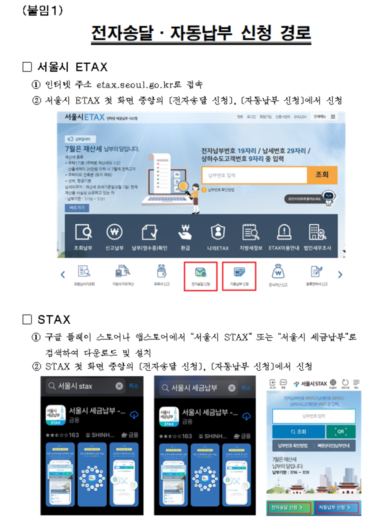 전자송달과 자동납부는 세금납부시스템(ETAX) 또는 모바일 세금납부 앱(STAX)에서 신청할 수 있습니다.
