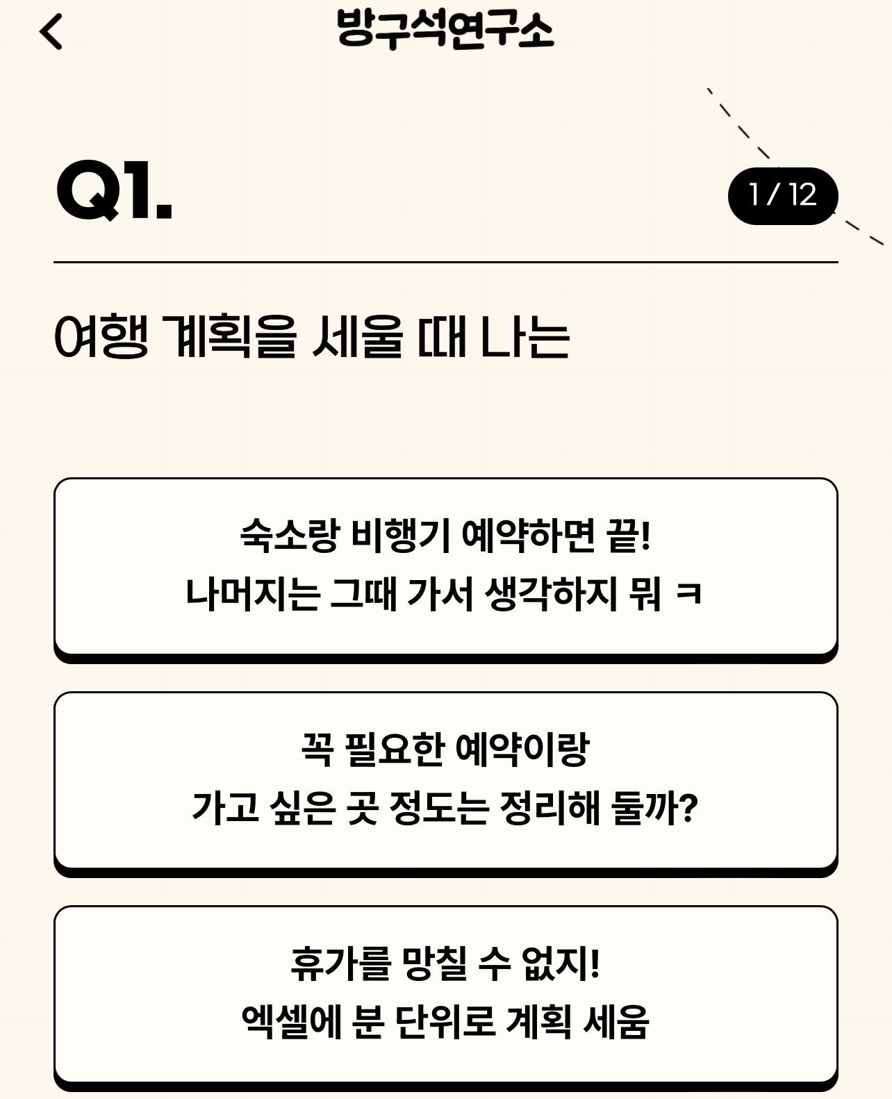 방구석연구소라는 사이트에서 친구랑 여행을 떠날 때 우리의 케미는 얼마나 잘 맞는지 알아보는 ‘여행 성향 케미 테스트’라고 나왔는데 여러분들께 설명드리고자 합니다.