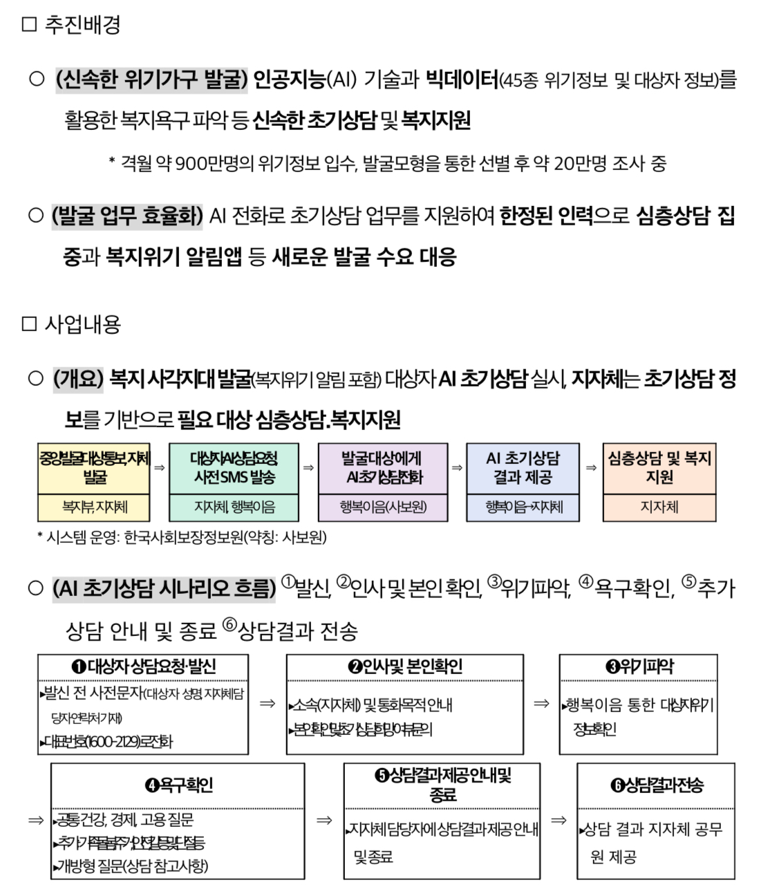 앞으로는 지자체 공무원이 직접 연락하여 실시하는 ‘초기상담’ 단계에서 인공지능(AI) 시스템으로 해당 가구에 직접 전화를 하고 시나리오에 기반한 상담*을 진행함으로써 발굴업무의 효율성이 높아질 것으로 기대된다고 합니다.