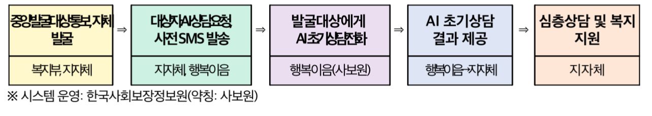 이후 인공지능(AI) 시스템이 사전에 파악된 위기가구에 전화(1600-2129, 발신전용)하여 복지도움이 필요한 상황인지 파악하는 초기상담을 진행하게 된다고 합니다.