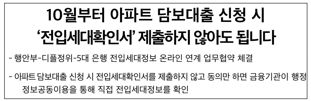 이렇게 되면 10월에는 아파트 담보대출 신청 시 ‘전입세대확인서’를 제출하지 않아도 대출 신청자가 정보 제공 동의만 하면 행정안전부가 행정정보공동이용시스템을 통해 5대 은행에 해당 아파트의 전입세대정보를 제공한다고 합니다.
