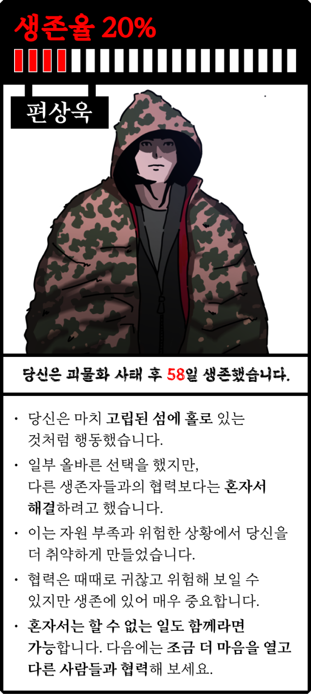 • 일부 올바른 선택을 했지만, 다른 생존자들과의 협력보다는 혼자서 해결하려고 했습니다.