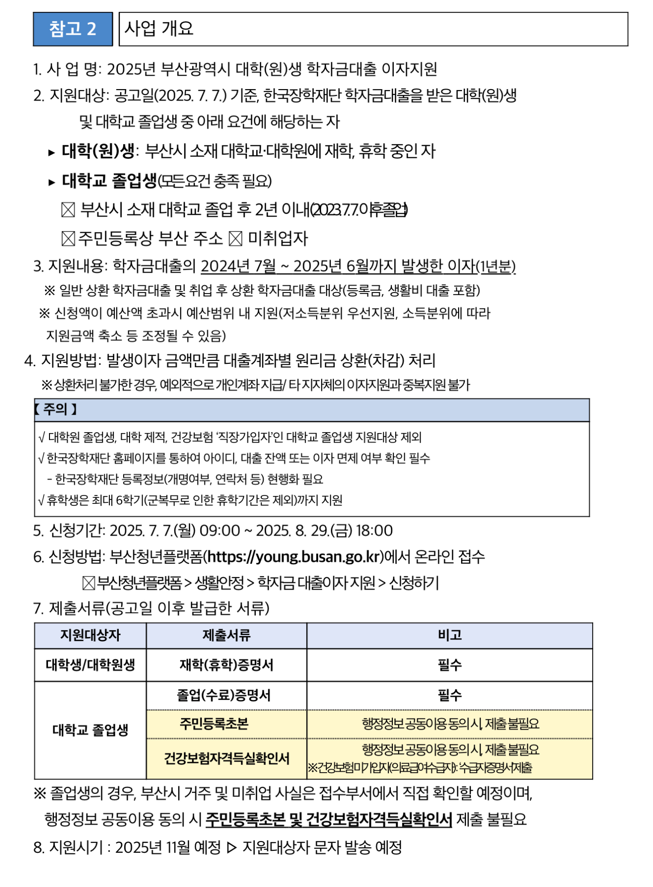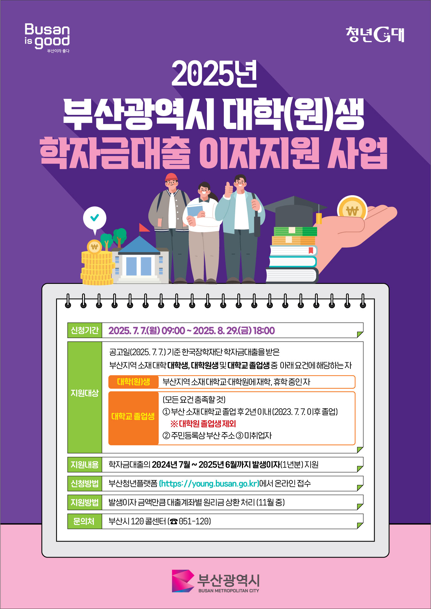 부산시(시장 박형준)는 「2025년 부산광역시 대학(원)생 학자금대출 이자지원 사업」 신청자를 모집한다고 밝혔습니다.