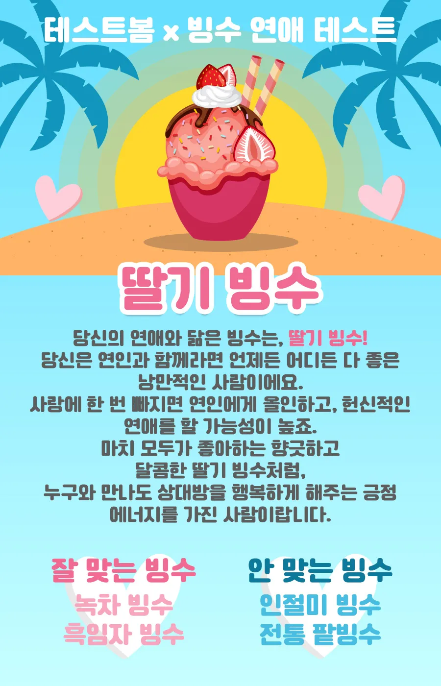 마치 모두가 좋아하는 향긋하고 달콤한 딸기 빙수처럼, 누구와 만나도 상대방을 행복하게 해주는 긍정 에너지를 가진 사람이랍니다.