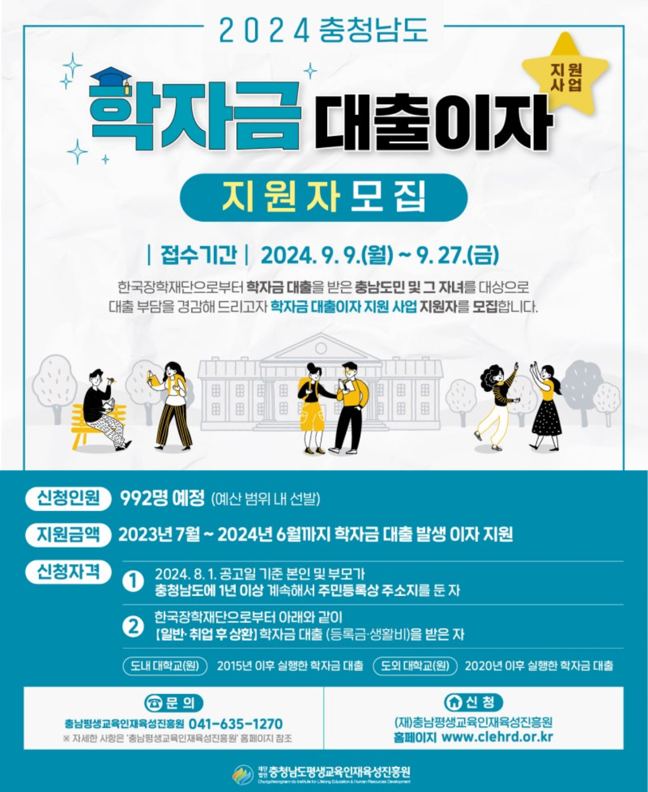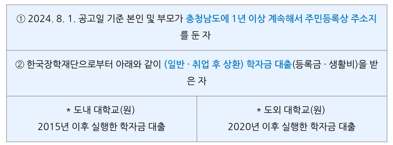 한국장학재단으로부터 학자금 대출을 받은 충남도민 및 그 자녀를 대상으로 대출 부담을 경감해 드리고자 시행한다고 하는데 관심 있는 분들은 반드시 신청해서 지원받아보시길 바랍니다.
