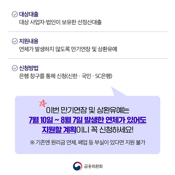 이번 만기연장 및 상환유예는 7월 10일 ~ 8월 7일 발생한 연체가 있어도 지원할 계획이니 꼭 신청하시길 바랍니다.
