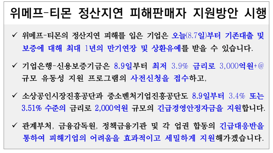 금융위원회에 따르면 티몬 위메프 정산지연 피해판매자 지원방안 시행 관련 내용이 나왔다는데 이에 설명드리겠습니다.