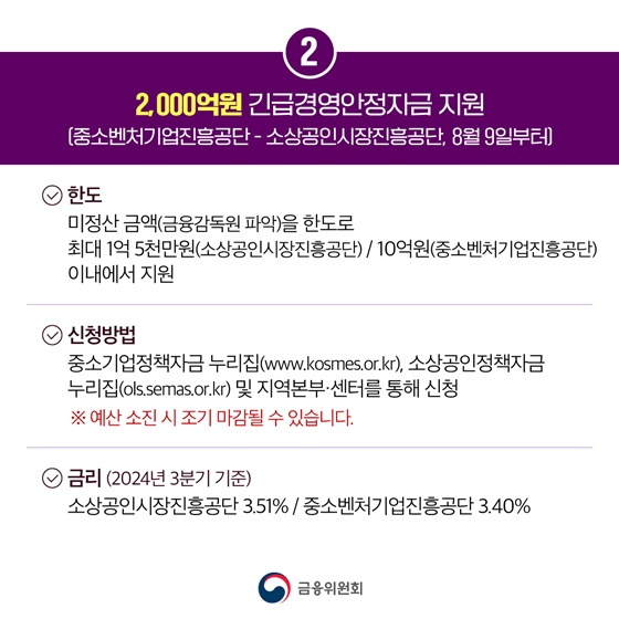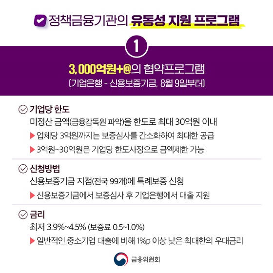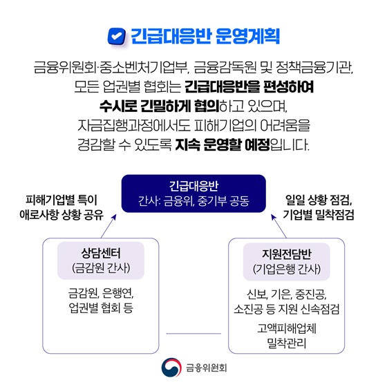 금융위원회·중소벤처기업부, 금융감독원 및 정책금융기관, 모든 업권별 협회는 긴급대응반을 편성하여 수시로 긴밀하게 협의하고 있으며, 자금집행과정에서도 피해기업의 어려움을 경감할 수 있도록 지속 운영할 예정이라고 합니다.