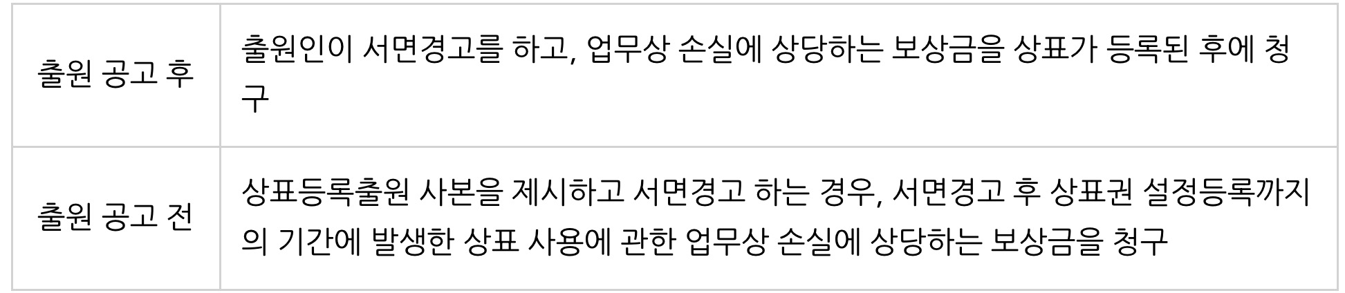 • 상표 등록 시, 경고장을 받은 시점부터 보상금 지급해야 함