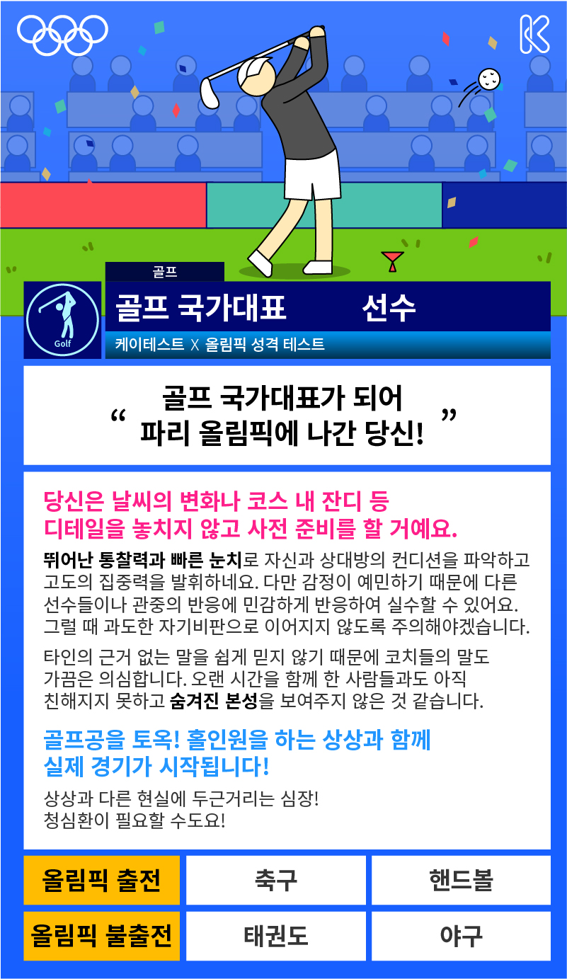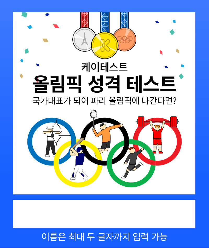 국가대표가 되어 파리 올림픽에 나간다면 어떨지 알아보는 ‘올림픽 성격 테스트’가 케이테스트란 사이트에 나와서 여러분들께 소개드리겠습니다.