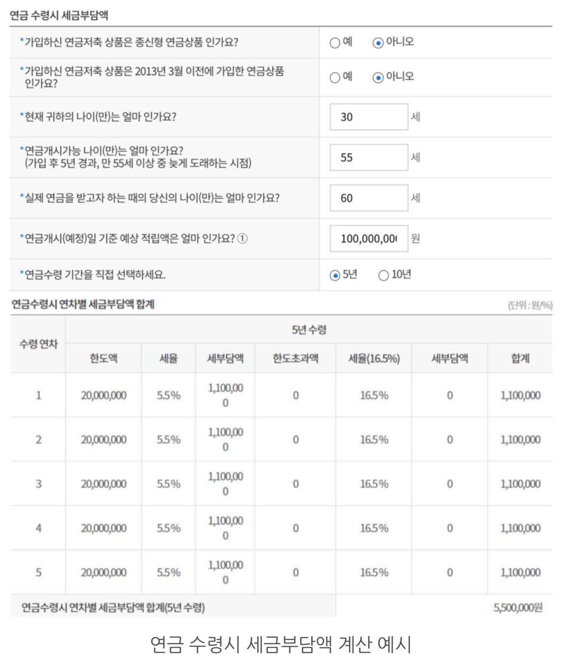 현재 나이, 연금개시가능 나이, 예상 적립액 등을 입력하시면 연금 수령시 세금부담액을 확인하실 수 있습니다