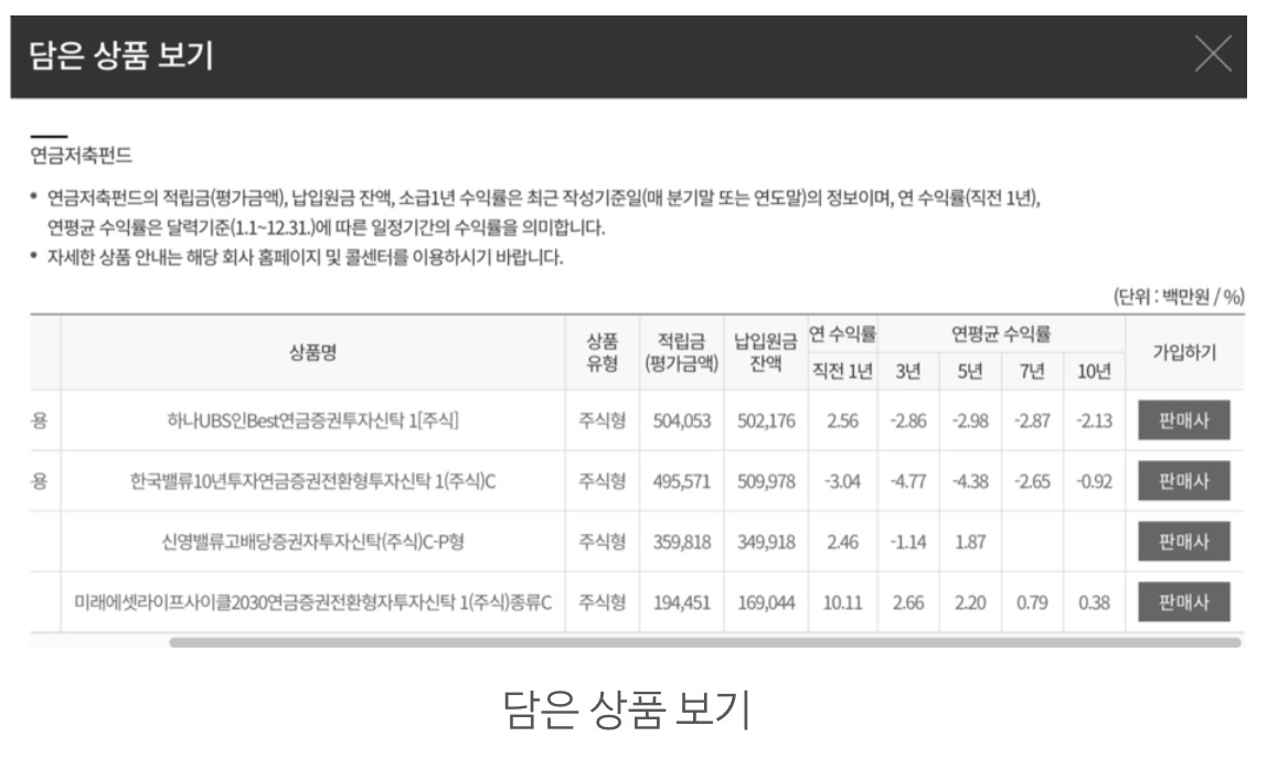 마음에 드는 금융상품들을 선택하시면 상품유형, 적립금, 연수익률(직전 1년, 이후 3,5,7,10)년의 수익률을 한 눈에 비교하실 수 있고, 가입하기 버튼을 클릭하시면 바로