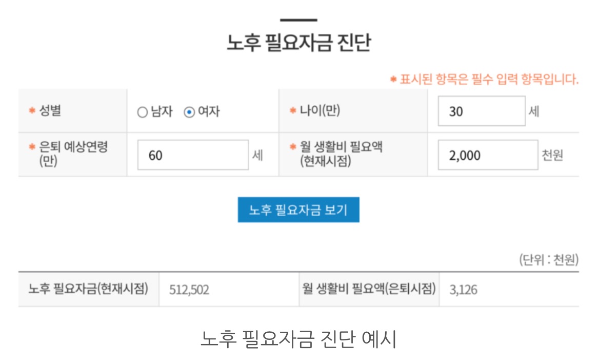 기존 '노후 재무설계' 기능이 회원 가입 없이도, 간단한 정보입력(나이, 은퇴시기 등)만으로 노후필요 자금 및 월 생활비 필요액을 계산할 수 있도록 개선되었습니다.