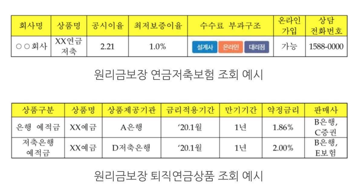 원리금보장 퇴직연금상품에는 은행 및 저축은행 예적금, 원리금보장 파생결합사채(ELB), 이율보증형 보험(GIC) 등이 포함되며, 조회시점에 판매중인 원리금보장상품별 수익률 및 판매사를 통합 공시할 예정입니다.