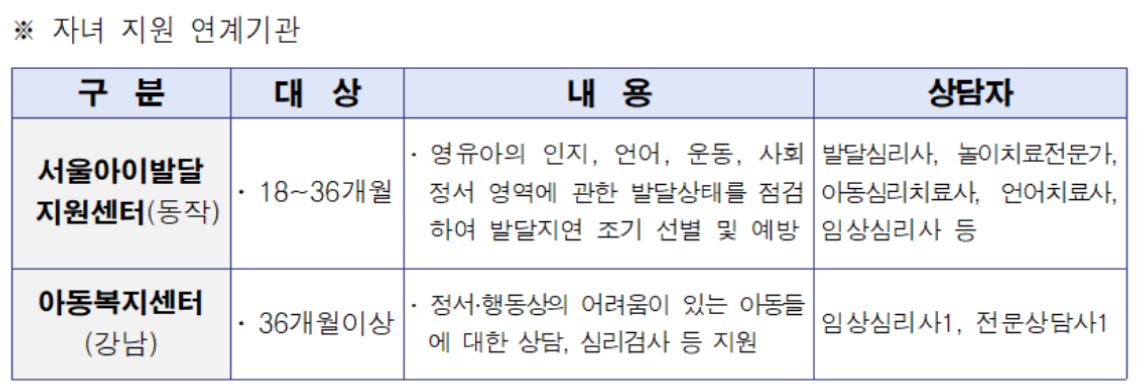 자녀의 성장 시기별 자극 결여 등으로 인해 발달지연이 우려되는 경우에는 서울아이발달지원센터 등 전문 기관 개입을 통해 자녀의 균형성장을 지원할 방침이다. 사례관리 또는 연계기관을 통해 가정이 모니터링 될 수 있도록 지원체계를 촘촘하게 운영한다.