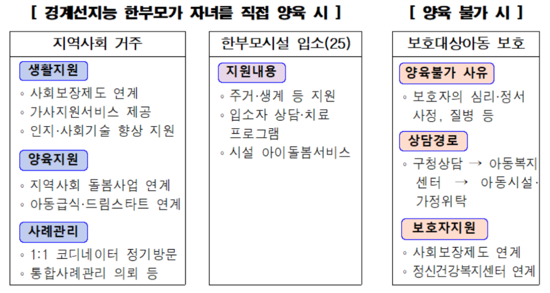 사례관리위원회 의견 토대로 맞춤형 서비스가 제공된다는데 경계선지능 한부모가 직접 양육하기를 희망하는 경우 '한부모가족지원센터(통합지원단)' 지원을 받을 수 있습니다.