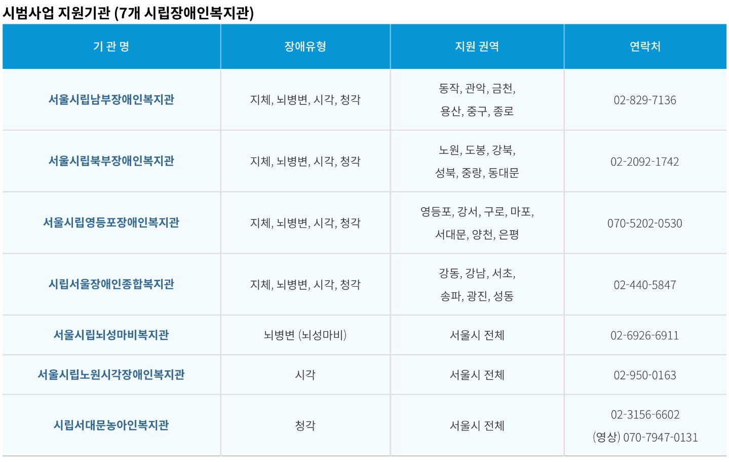 시립서울장애인종합복지관 / 지체, 뇌병변, 시각, 청각 / 강동, 강남, 서초, 송파, 광진, 성동 / 02-440-5847