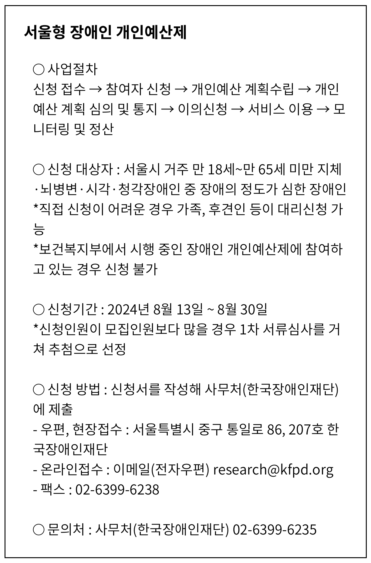 서울시 장애인 개인예산제 신청기간은 2024년 8월 13일부터 30일까지며 최종 참여 대상자는 한국장애인재단에서 9월 6일 이후 개별 안내할 예정이라고 합니다.