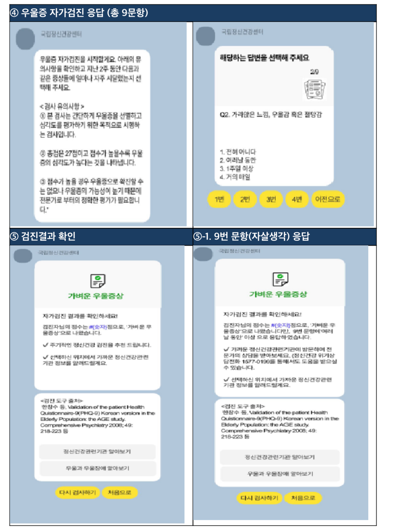 우울증 검진도구 PHQ-9은 현재 국가건강검진에서 활용 중인 것과 동일한 것으로 저작권자인 고려대학교 구로병원 한창수 교수의 협조로 활용된다는디 향후 수요를 고려하여 불안증, 조기정신증 등 다른 질환과 관련된 검진도구도 순차적으로 추가할 예정이라고 합니다.