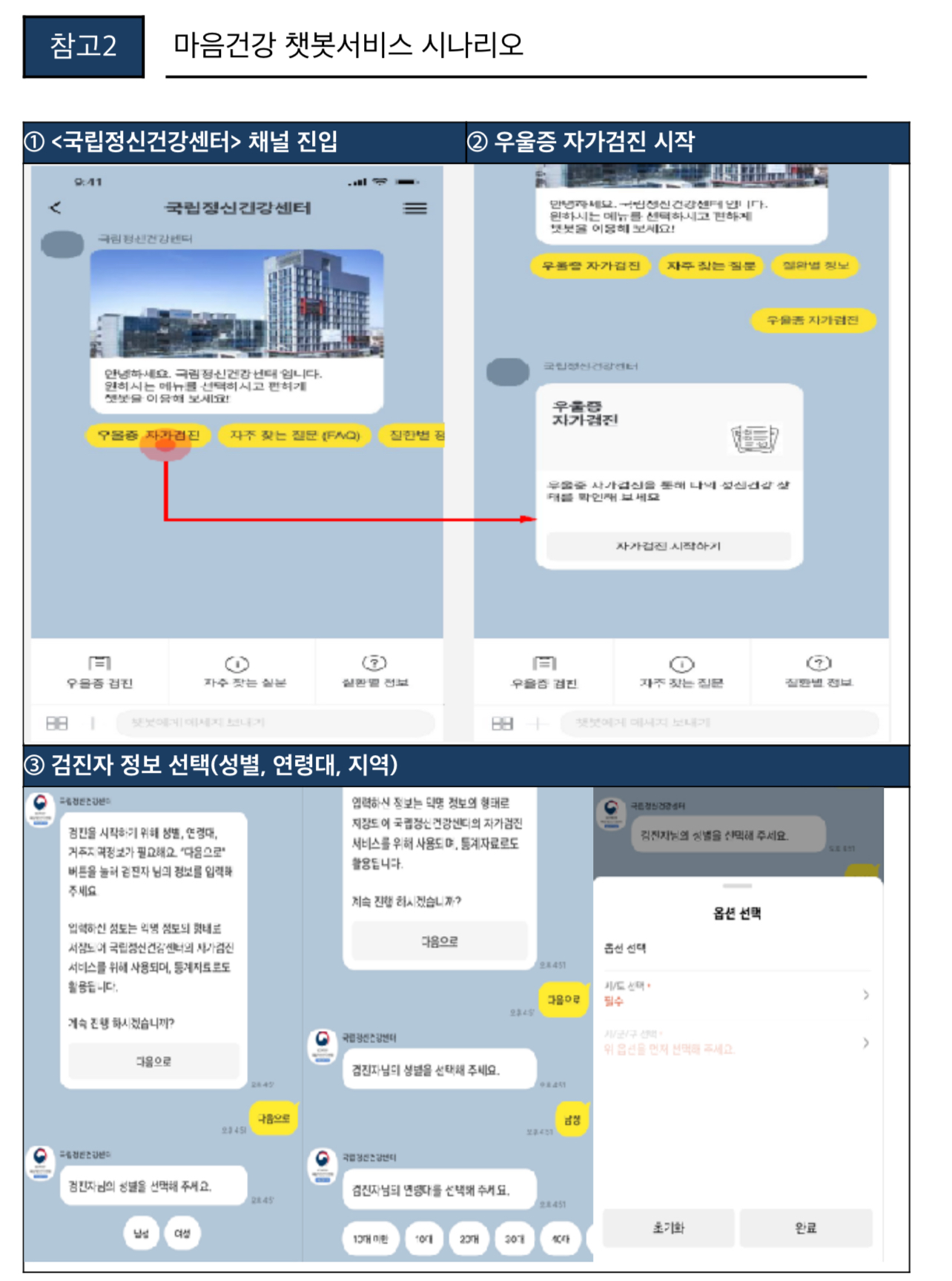 이용자는 자신의 성별, 연령대, 사는 지역을 입력한 후 자가검진을 실시할 수 있으며 그 결과에 따라 가까운 정신건강 관련 기관* 정보를 안내받을 수 있습니다.