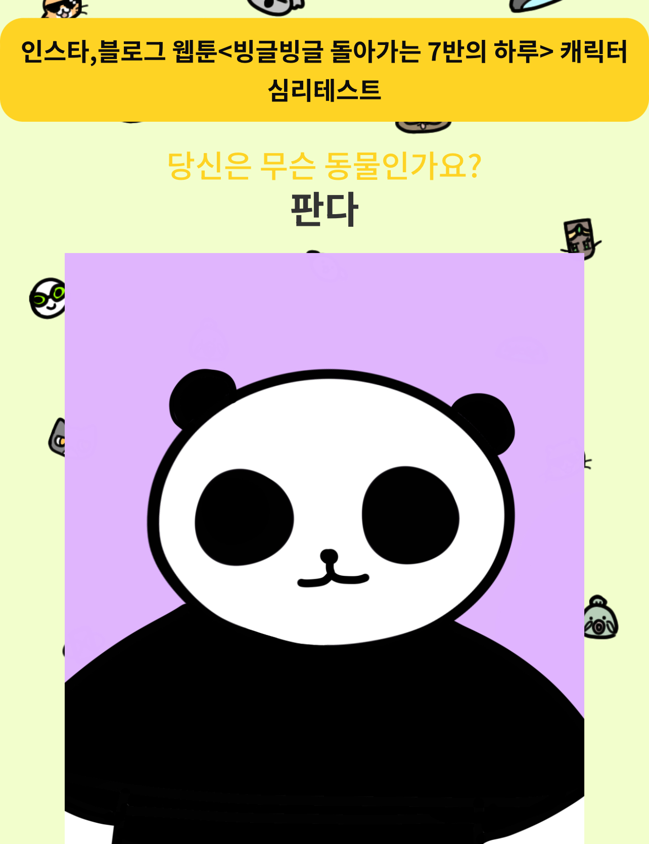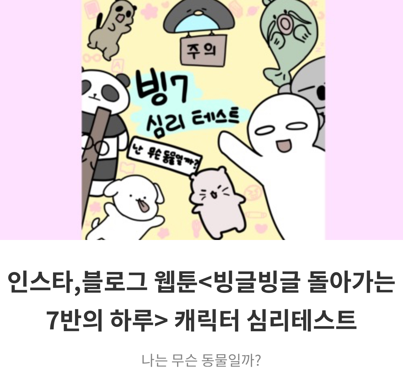 인스타, 블로그 웹툰 ‘빙글빙글 돌아가는 7반의 하루 캐릭터 심리테스트’가 있다고 하는데 나는 무슨 동물일지 알아보시길 바랍니다.