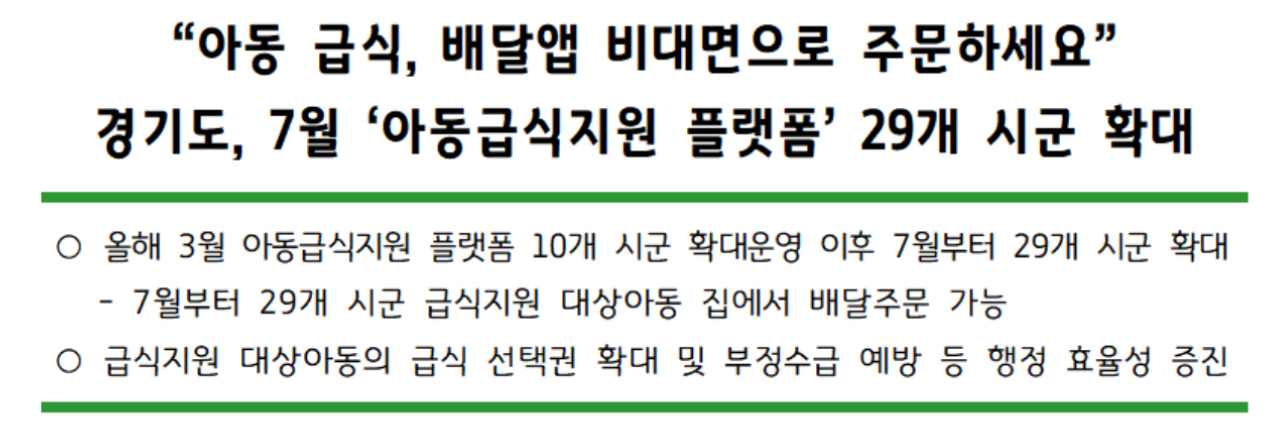 경기도가 급식지원 대상아동들이 이용하는 배달앱 ‘경기도 아동급식지원 플랫폼’을 2024년 7월부터 29개 시군으로 확대 운영한다. 현재는 10개 시군에서만 운영하고 있습니다.