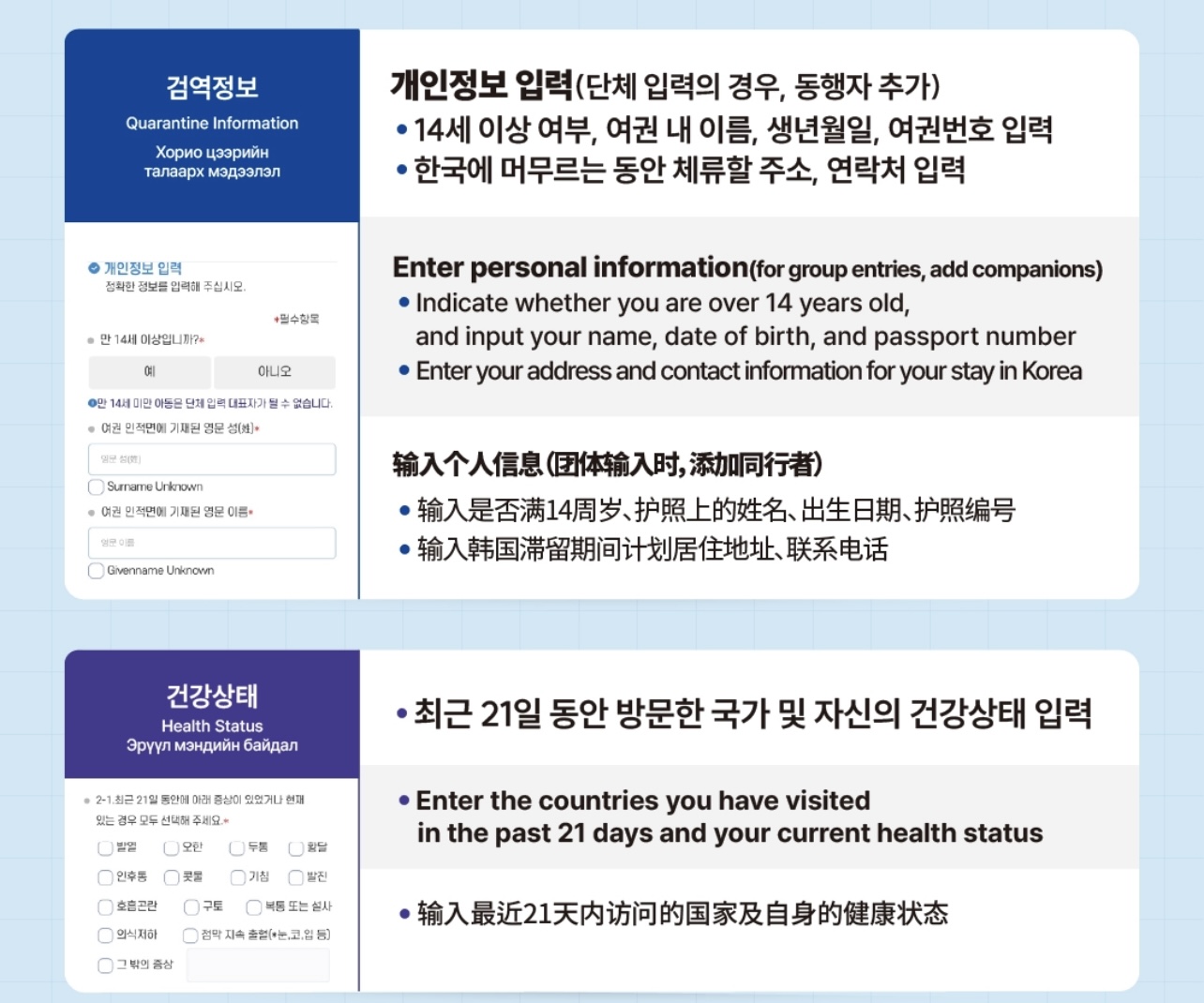 • 최근 21일 동안 방문한 국가 및 자신의 건강상태 입력