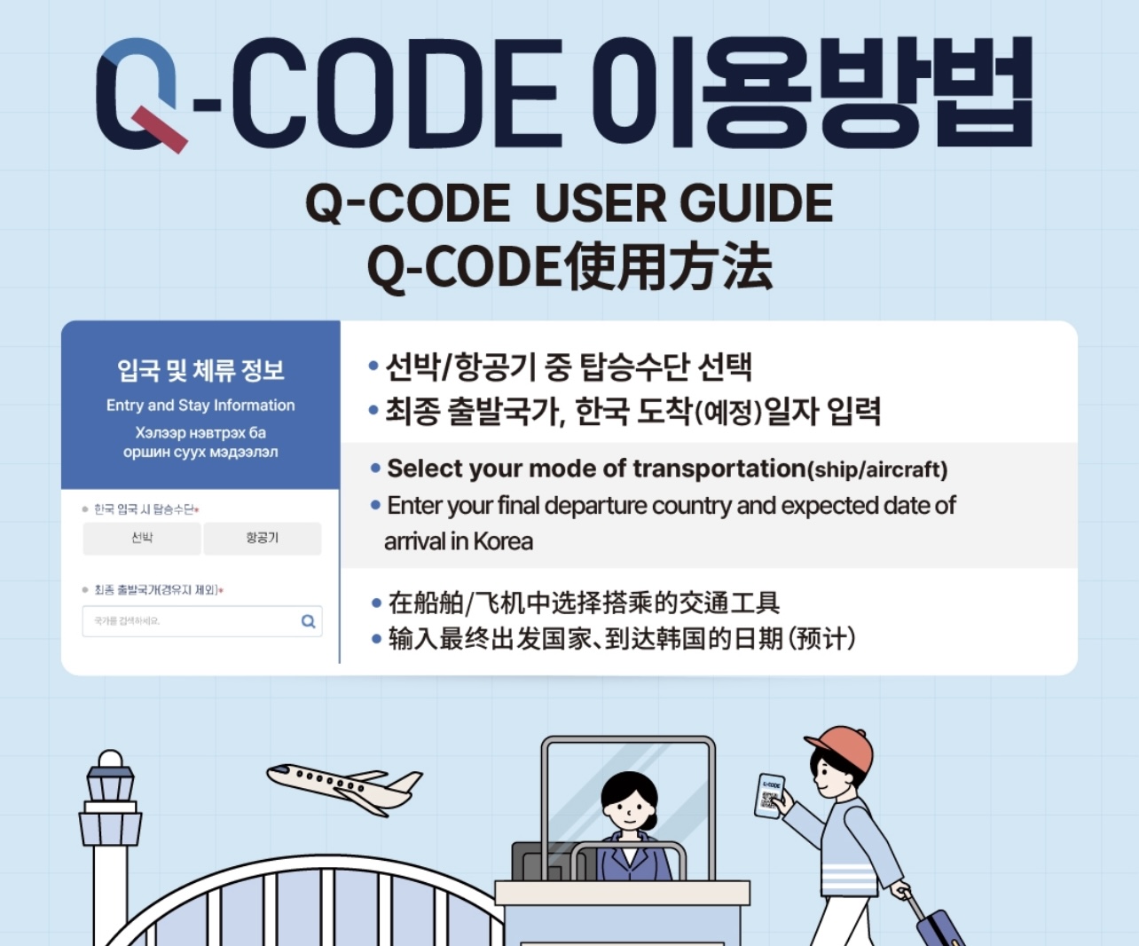 Q-CODE란 휴대폰 등으로 건강상태를 입력한 후, 발급받은 QR코드를 통해 검역하는 방법입니다.