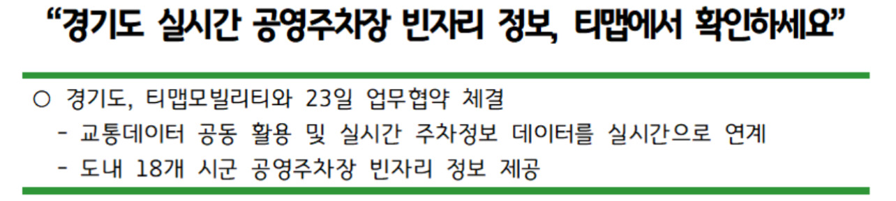 협약 내용은 티맵 앱에서 도내 시군 공영주차장 실시간 주차 정보를 확인할 수 있도록 경기도가 관련 데이터를 티맵모빌리티에 제공하는 내용이라고 합니다.