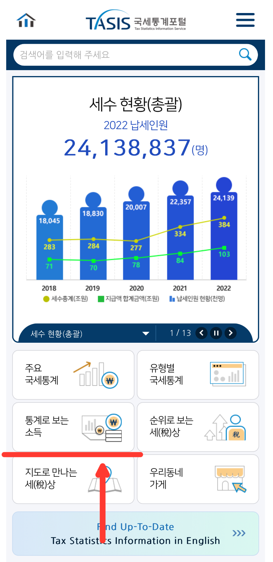 2. 국세통계포털 접속 후 ‘통계로 보는 소득 클릭’