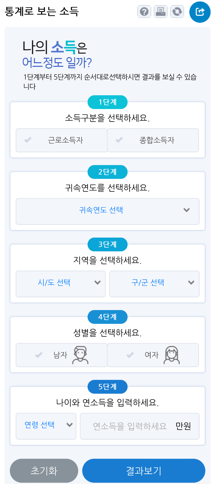 3. 1단계부터 5단계까지 순서대로선택하시면 결과를 보실 수 있습니다.