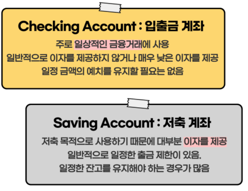 Checking Account는 입출금 계좌인데 일상적인 금융거래에 사용되며 일반적으로 이자를 제공하지 않거나 매우 낮은 이자를 제공합니다.