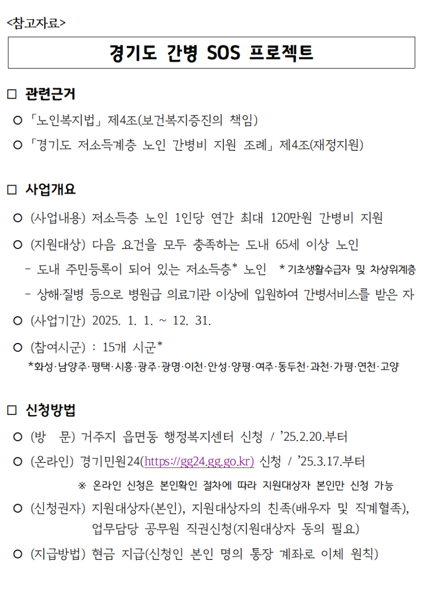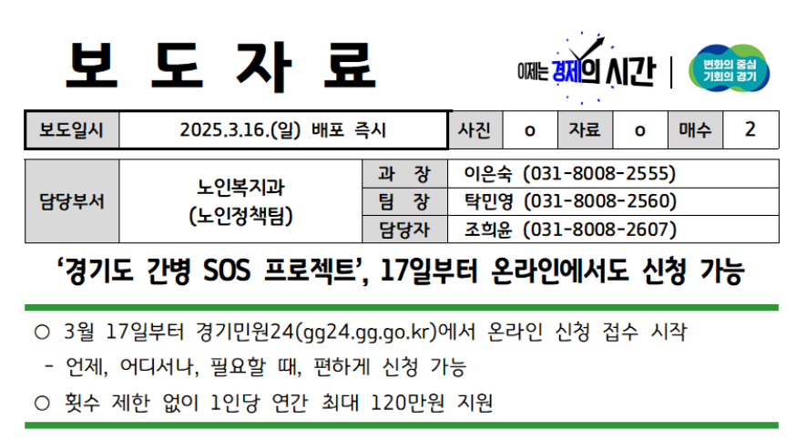 경기도가 전국 광역자치단체 최초로 저소득 노인의 간병비 부담 경감을 위해 시행 중인 ‘간병 SOS 프로젝트’의 온라인 신청이 2025년 3월 17일부터 시작된다고 합니다.